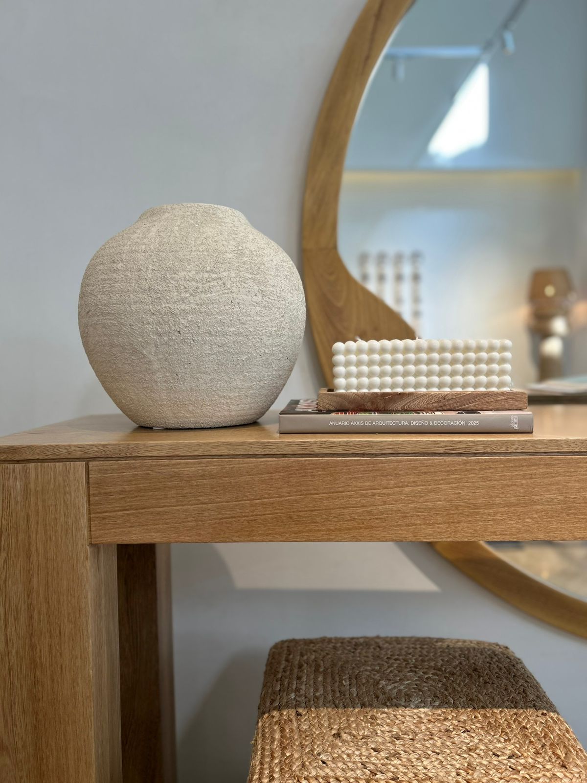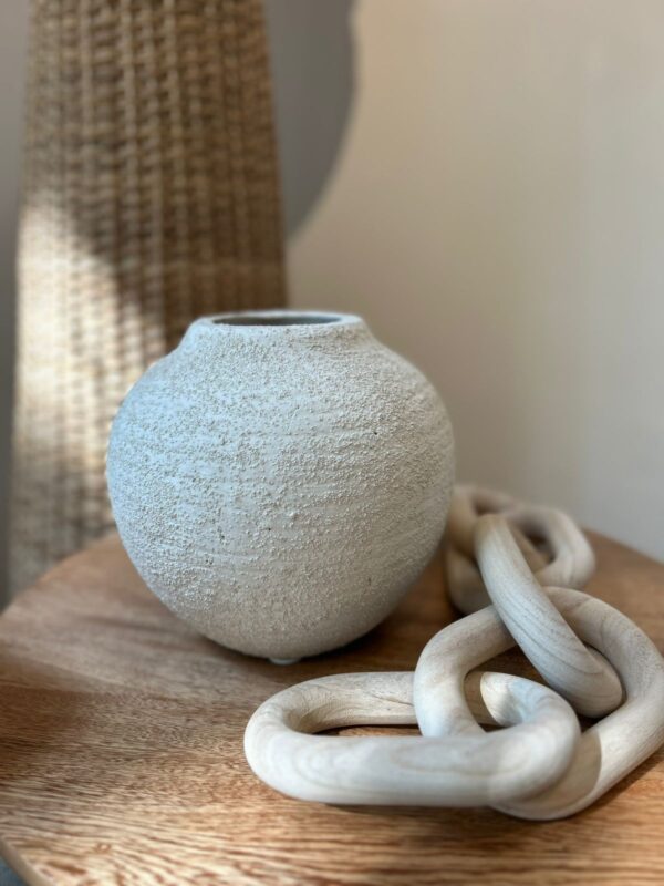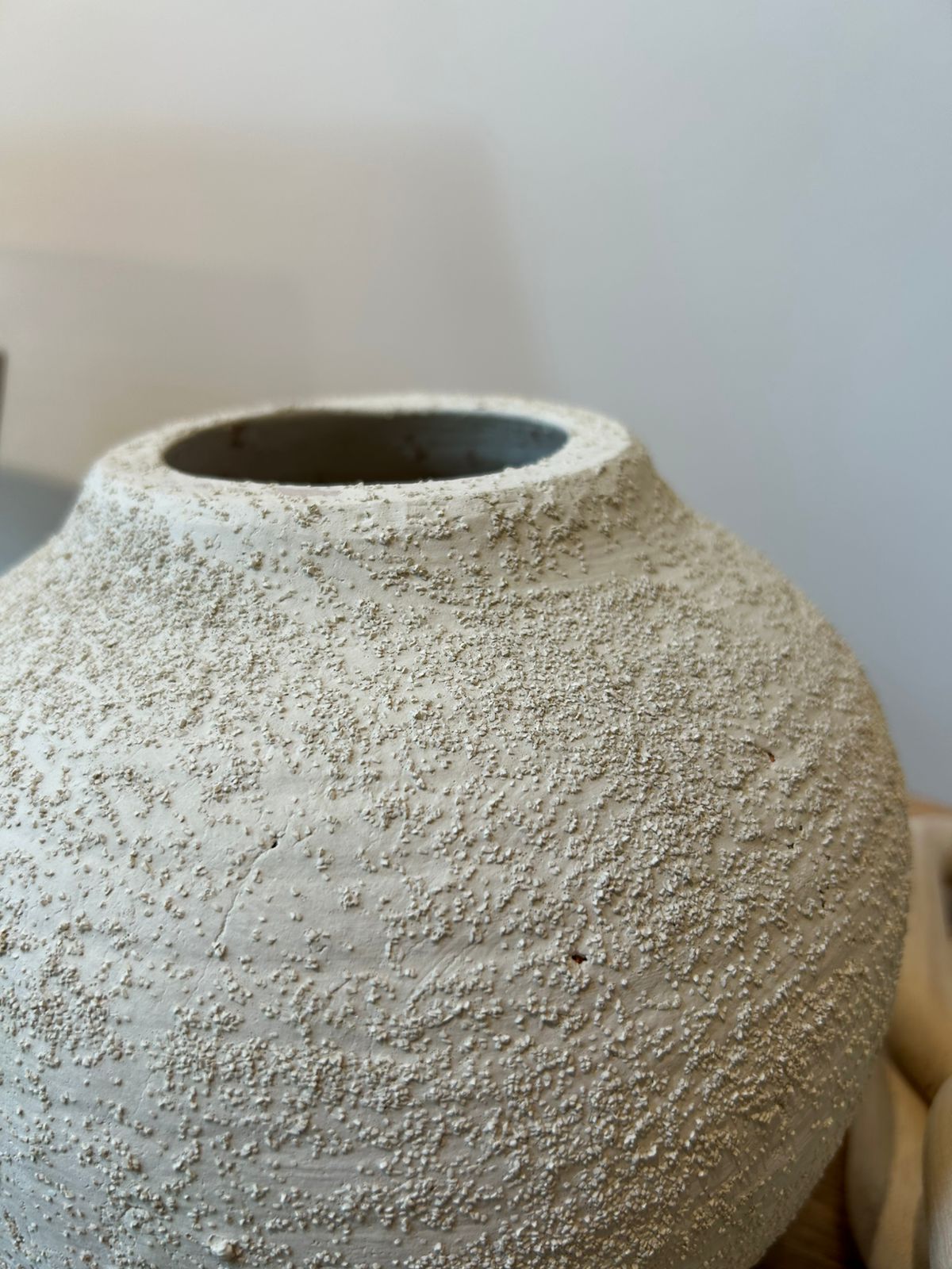 Jarrón órganico artesanal, está acabado en un blanco mate ligeramente hueso, con una textura rugosa y artesanal, tipo arena o cal, que le da caracter y un look muy natural.